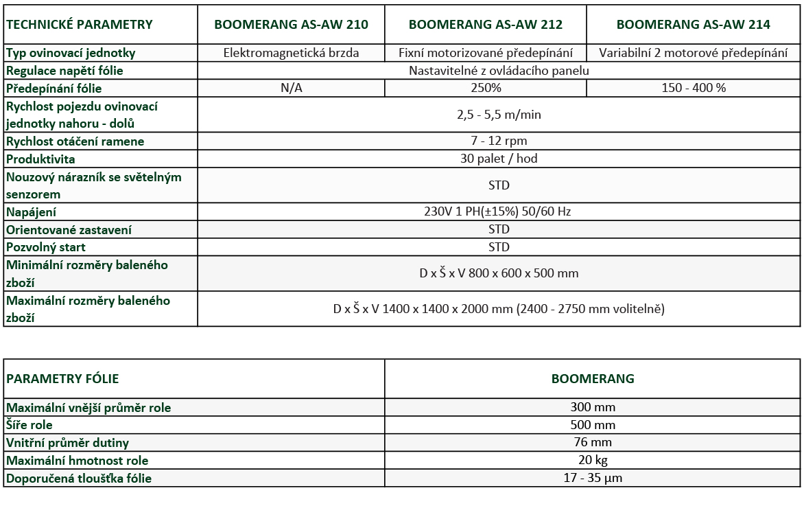 Stručně řečeno, BOOMERANG AS/AW nabízí různé konfigurace ovinovacích jednotek a širokou škálu programovatelných nastavení, což z něj činí flexibilní a všestranný nástroj pro balení do stretch fólie. Intuitivní ovládací panel zjednodušuje správu parametrů a programů pro optimalizaci procesu balení.