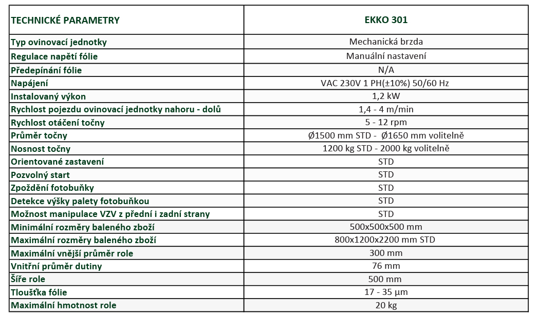 EKKO 301, stroj navržený s dokonalou rovnováhou pokročilé balicí technologie a jednoduchým, efektivním designem. Byl vyvinut v souladu s nejpřísnějšími mezinárodními bezpečnostními předpisy. Zvláštní pozornost byla věnována úpravě zrychlení a zpomalení točny, čímž byla zajištěna maximální bezpečnost při manipulaci s nestabilními nebo zvláště citlivými předměty.