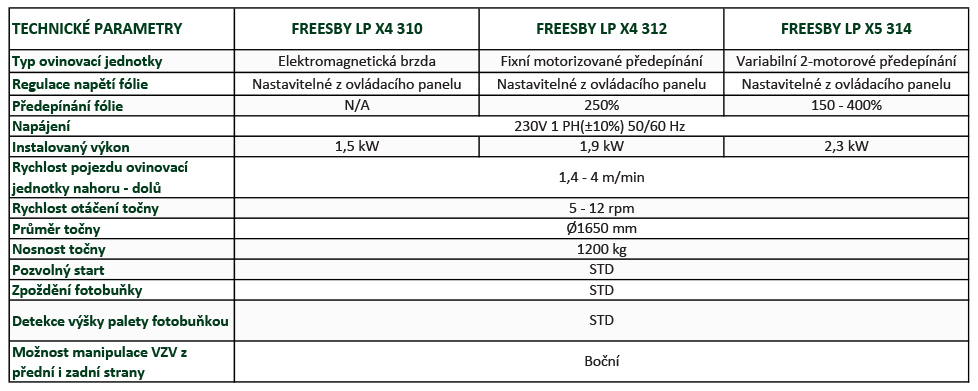 FREESBY LP má k dispozici tři různé ovinovací jednotky se zařízením pro utahování fólie prostřednictvím elektromagnetické brzdy nastavitelné z ovládacího panelu.